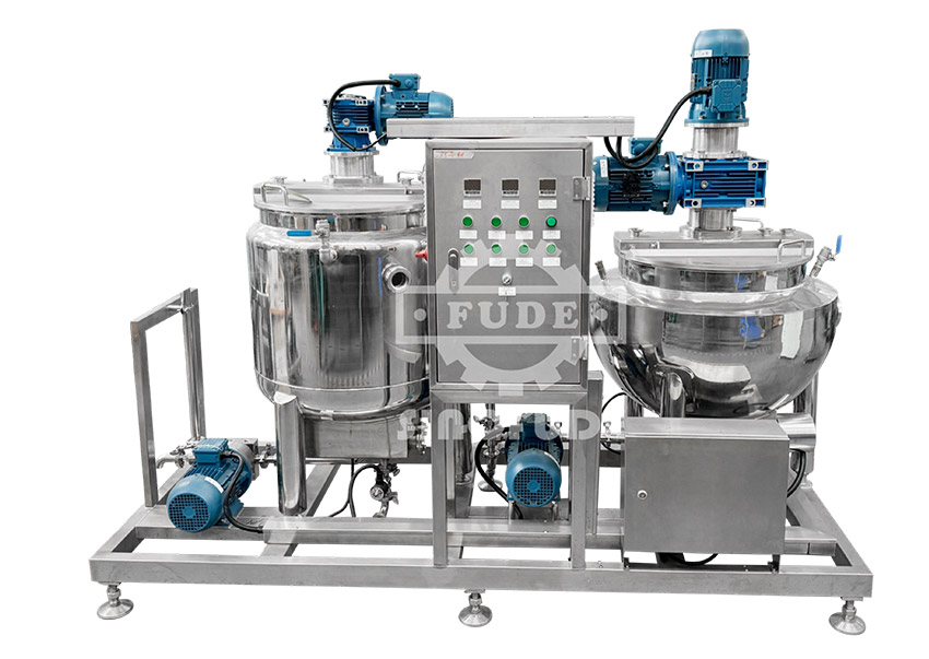 The raw material processing part of the CBZ50A production line. Sodium alginate solution, syrup, etc. are cooked here. It consists of 2 cookers, 2 storage tanks and transfer pumps. It can be equipped with a high-speed shearing machine and 3-layers insulation jacket cooking.