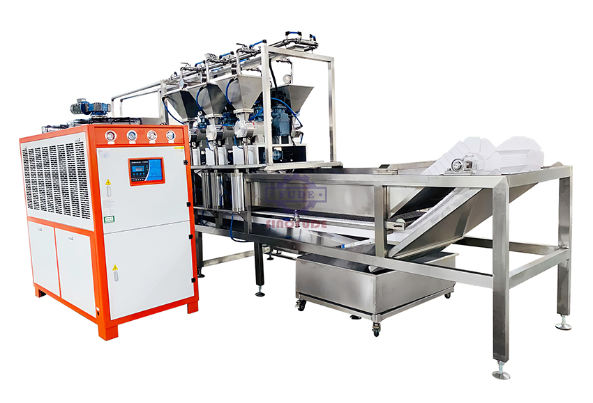 Hot water jacketed hopper to prevent Crystal syrup from solidifying The delivery pump is connected to the extrusion nozzle, suitable for liquids of different concentrations.