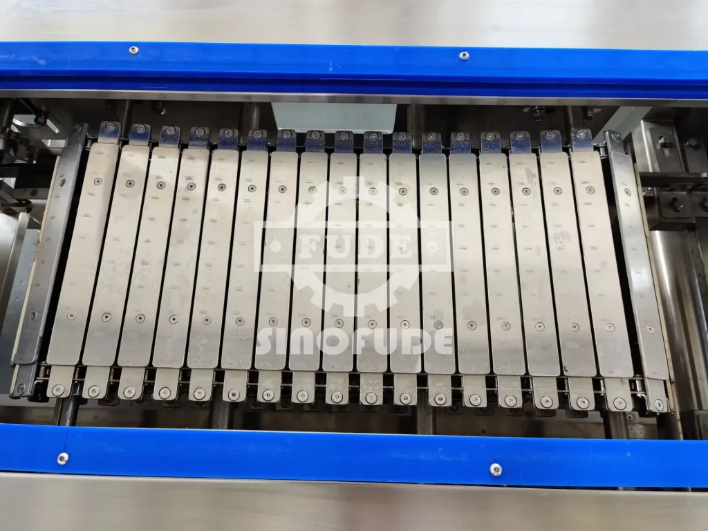 Chain type de-molding with two brushes installed and with air knife for 100% de-molding.