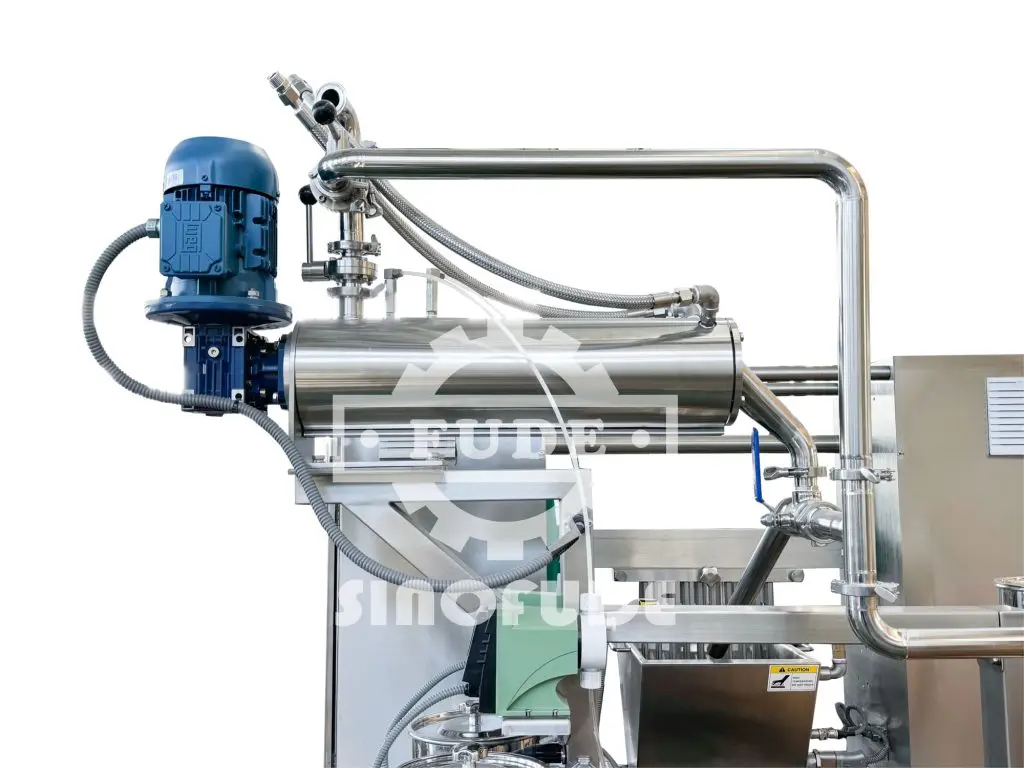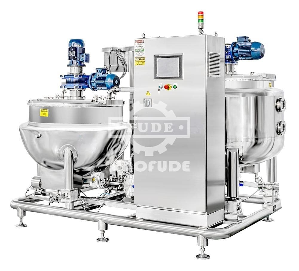 The jacket cooker and storage tank are designed on a rack for easy operation and cleaning. The electric control cabinet controls the processes of stirring, boiling, mixing, storage, etc. The jacket cooker is used to dissolve raw materials, the formula ratio of glucose syrup, sugar, water, gel powder, etc. is put into the cooker, melted, and boiled, after boiling to a certain temperature, transferred to the storage tank through the pump to ensure continuous production. The plates and racks are made entirely of stainless steel. The cooker can be electric or steam heating; the tank is heated by a warm water layer, with stirring, connected with the hot water tank, used to slightly reduce and maintain the material temperature so that the liquid temperature is uniform, and the syrup after cooking is transported to depositing machine through the pump.