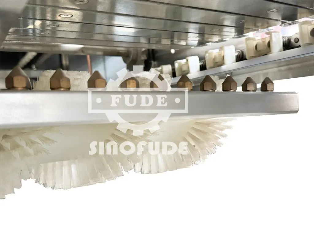 Chain type de-molding with two brushes installed and with air knife for 100% de-molding.