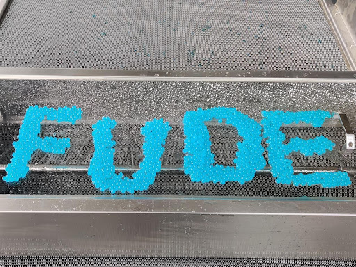 The molding principle of popping boba is the solidification reaction of sodium alginate and calcium. The core material containing calcium are put into the depositor hopper of the popping boba production line, while the sodium alginate solution is circulated in the forming tank below the hopper. The core material will drip into the sodium alginate solution through the movement of the ram to form popping boba